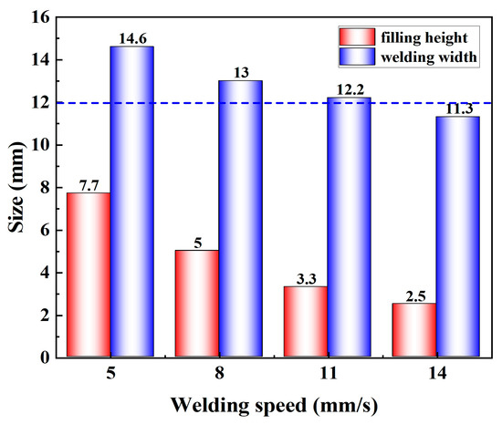 Using the process parameters described above for narrow-gap welding, a wire feeding speed of 8 m/min was adopted for the two wires in the subsequent welding process. Initially, experiments were conducted without a double-wire lateral distance, meaning the two wires were in the same plane. Figure 9 displays the weld seam formation and cross-sectional morphology under different welding speeds. It is clear from an overhead view that as welding speed increases, the scale-like patterns on the weld seam surface become denser. At welding speeds of 5 mm/s and 8 mm/s, the weld seam surface appears aesthetically pleasing. However, at higher welding speeds of 11 mm/s and 14 mm/s, insufficient heat input leads to the poor wettability of the filling metal on the sidewalls. The cross-sectional morphology clearly illustrates the weld seam. At a welding speed of 5 mm/s, with higher heat input and more filling metal deposition, an undercut is observed, and the defect of lack of fusion at the groove root corner occurs. Decreasing heat input may contribute to suppressing undercut defects, but inadequate heat input will lead to the defect of lack of fusion on the sidewalls. Measuring was conducted on the filling height and welding width of the weld seam, with the results shown in Figure 10. As the welding speed increases from 5 mm/s to 14 mm/s, the filling height of the weld seam is reduced from 7.7 mm to 2.5 mm, and the welding width is reduced from 14.6 mm to 11.3 mm.