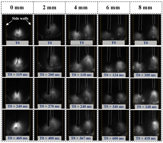 Figure 11. Arc and droplet behavior under different lateral spacings (0 mm, 2 mm, 4 mm, 6 mm, and 8 mm) at a welding speed of 11 mm/s from the front view.