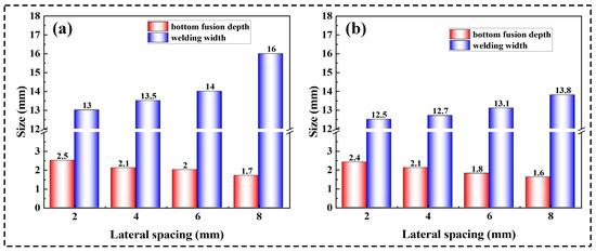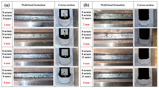 Figure 12. Weld bead formation and cross-section under different lateral spacings (2 mm, 4 mm, 6 mm, and 8 mm) at a wire feeding speed of 8 m/min for the double wires and welding speeds of (a) 8 mm/s and (b) 11 mm/s.