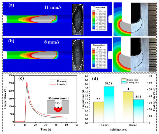Figure 16. Temperature field simulation results: (a,b) temperature field contour maps and heat source verification, (c) thermal cycle curve at the center of the weld seam, and (d) liquid time and cooling rate of the weld seam.