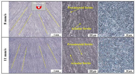 Figure 17 shows the microstructure of the fusion zone of welded joints obtained at welding speeds of 8 mm/s and 11 mm/s. The optical micrographs clearly display that the microstructure of the fusion zone exhibits a distinct growth direction, which grows from areas near the base metal toward the top of the weld seam at a certain angle, related to the heat dissipation direction of the molten pool. The microstructure of the fusion zone consists of proeutectoid ferrite (the white areas in the photos) and acicular ferrite (the black areas in the photos). Proeutectoid ferrite is the first to precipitate from the original austenite grain boundaries during the cooling process, while acicular ferrite appears as fine, directional ferrite within the original austenite grains [37,38]. The mechanism of acicular ferrite nuclear is complicated, and their nucleation and growth are affected by the chemical composition, the grain size of austenite, the size and distribution of nucleating particles, and the cooling rate [39,40,41,42]. At a welding speed of 8 mm/s, the content of proeutectoid ferrite in the fusion zone is higher than that at a welding speed of 11 mm/s, whereas the content of acicular ferrite is lower at 11 mm/s. This may be related to the time the liquid phase exists in the fusion zone and the cooling rate of the austenite because of the consistency of the other processing conditions. Numerical simulation results indicate that, at higher welding speed (11 mm/min), the peak temperature of the molten pool is lower (about 2337 °C), the existence time of the liquid metal is shorter, and the cooling rate of the austenite is higher, which promotes the nucleation of acicular ferrite and suppresses the formation of proeutectoid ferrite at high temperatures. High-magnification metallographic images show that the microstructure of the fusion zone of the welded joint obtained at 11 mm/s is denser, which is also related to the faster cooling rate. Similar results were also found in the studies of Lv et al. [43] and Fang et al. [44].