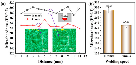 Figure 18. Comparison of microhardness of welded joints fusion zone at different welding speeds: (a) microhardness distribution and (b) average microhardness value.