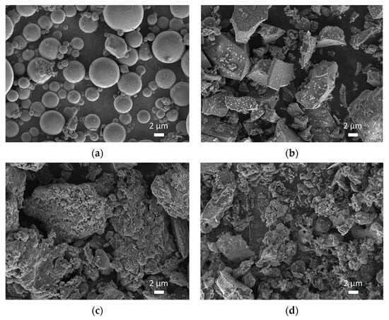 SEM images of silica–alumina precursors and additives: (a) fly ash, (b) slag powder, (c) calcium carbide slag, and (d) furnace slag.