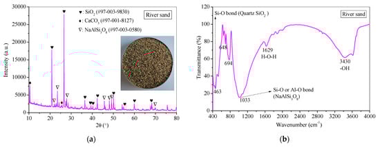 The fine aggregate used in the study was river sand, which possesses a fineness modulus of 2.62 and a bulk density of 2.64 g/cm3 [43]. The sand is predominantly composed of quartz (SiO₂), accounting for 92% of its chemical makeup. The presence of silicate and aluminosilicate impurities within the sand was confirmed through FTIR and XRD analysis, as depicted in Figure 2.