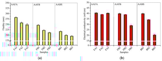 (a) Fluidity and (b) electrical conductivity of fresh alkali-activated mixtures incorporating FS or CS.