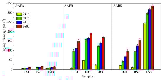 Drying shrinkage of alkali-activated mortars incorporating FS or CS with curing ages.