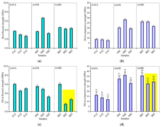 (a) The 28-d flexural strengths, (b) 28-d compressive strengths, (c) 360-d flexural strengths, and (d) 360-d compressive strengths of alkali-activated mortars incorporating FS or CS.
