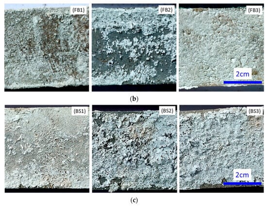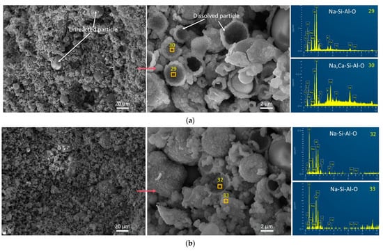 In contrast, FS, when combined with SP in alkali-activated systems, induces the formation of microcracks (Figure 8 and Figure 9), likely due to self-shrinkage or carbonation processes. The incorporation of SP, which possesses a high number of reactive irregular particles [68,69], results in a denser matrix and enhanced compressive strength due to accelerated hydration and gel formation [70]. Notably, the alkali-activated FA-SP system with CS (FB2 sample) demonstrates a higher degree of compactness and greater compressive strength than the corresponding FS-containing FB3 sample (Figure 8b). At room temperature, the incorporation of 20% FS fails to chemically enhance the microstructure of the AAMs. This is one of the reasons why FS is not commonly utilized as an aluminosilicate precursors but is more likely to be used as a silico–aluminon additive. Comparing the morphological characteristics of FS in Figure 7c, Figure 8c and Figure 9c with those in Figure 1d (Section 2.1), it is observed that the gel matrix of FA3, FB3, and BS3 contains unreacted, irregular FS particles. Therefore, this proves that FS has partially played a physical filling role and partially participated in the chemical hydration or polymerization process.