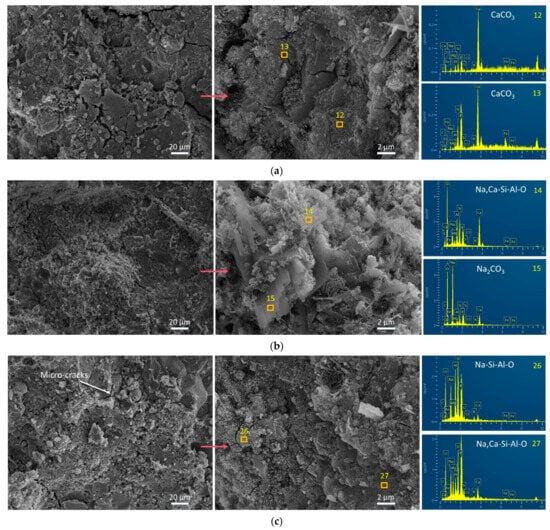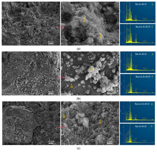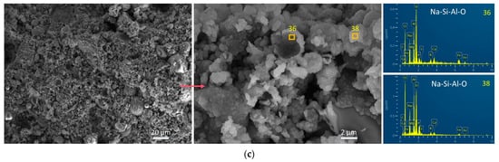 SEM images and EDS spectra of 360 d samples from the AABS system. (a) BS1, (b) BS2, and (c) BS3.