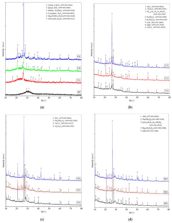 X-ray diffraction (XRD) patterns are employed to ascertain the mineral composition of samples (Figure 10). In the raw materials, SP exhibits amorphous peaks aside from crystalline diffraction peaks of CaCO3 induced by carbonation [72], while the primary crystalline constituents of FA are quartz (SiO2) and mullite (Al2OSiO4) [73], with the remaining peaks being amorphous (Figure 10a). FS displays amorphous humps along with crystalline components such as SiO2, Mg4Cl(OH)7·6H2O, and (Na, Ca)(Si, Al)4O8. In contrast, the crystalline composition of CS predominantly consists of CaCO3, SiO2, and Al2O3. The crystalline compositions of FS and CS are generally stable, with substances undergoing chemical hydration or polymerization reactions assigned to humps between 15° and 30° 2θ. Furthermore, river sand comprises major crystalline phases of SiO2, CaCO3, and NaAlSi3O8 (Figure 2a, Section 2.1).