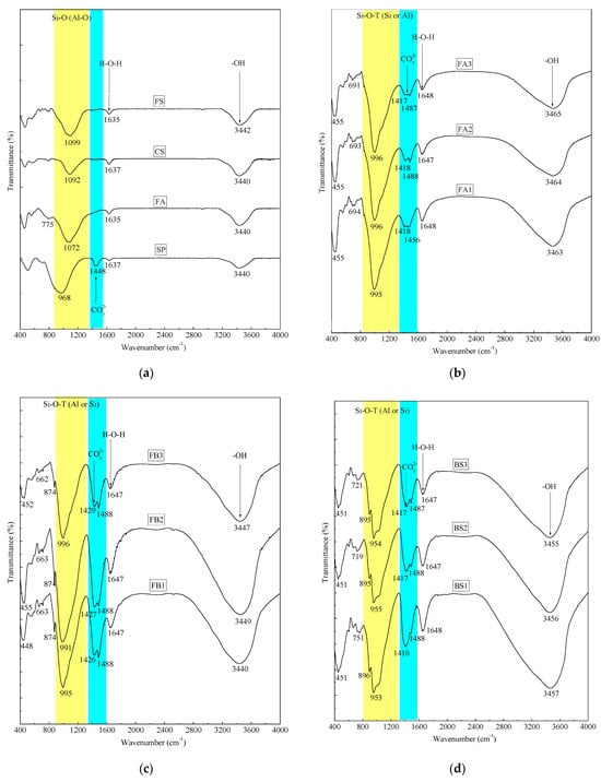Upon alkali activation of FA, the strong absorption peak of the Si–O–T (Al or Si) bond shifts from 1072 cm−1 (FA) to a lower wavenumber of 995 cm−1 (FA1) (Figure 11b), indicating the synthesis of Si–O–Al polymeric chains and the formation of aluminosilicate polymers [26,80]. Similarly, upon alkali activation of SP, the strong absorption peak of the Si–O–T bond shifts from 968 cm−1 (SP) to a lower wavenumber of 953 cm−1 (BS1) (Figure 11d), also suggesting the formation of aluminosilicate polymers. A comparison of the three alkali-activated systems, namely AAFA, AAFB, and AABS, reveals that a higher SP content results in a greater degree of aluminosilicate polymerization. When FS or CS is introduced into the three alkali-activated systems, the strong absorption peaks of the Si–O–T bonds show no significant changes compared to the control groups, except for a 4 cm−1 shift to lower wavenumbers for FB2 (Figure 11c). This indicates that the introduction of FS fails to significantly promote the polymerization of the Si–O–Al or Si-O-Si chains.