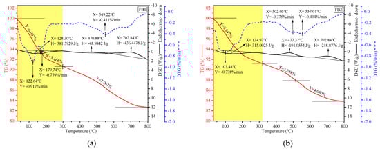 Incorporating FS or CS into AAFA system samples results in lower compaction (Figure 7), while their introduction into the AABS system generates microcracks (Figure 9). However, when FS or CS is incorporated into the AAFB system, the flexural and compressive strengths are higher, with significant differences in strength observed (Figure 6). Consequently, further investigation of the high-temperature stability of FS or CS incorporated into AAFB system samples is warranted. To ensure comparisons were performed at the same level, each group of samples was gradually heated from 30 °C to 800 °C, yielding TG, DSC, and DTG curves. This provides information on the mass loss rate under the same level of high temperature of 800 °C [54]. The TG-DSC curves and mass loss rates of FB1, FB2, FB3, FA3, and BS3 samples are displayed in Figure 12.