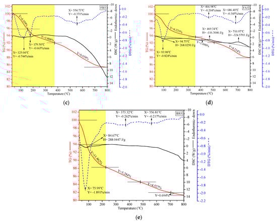 TG, DSC, and DTG curves of alkali-activated samples with FS or CS at 360 days. (a) FB1, (b) FB2, (c) FB3, (d) FA3, and (e) BS3.