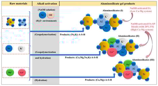 In summary, FS was added to the alkali-activated FA and/or SP system, where it served both roles—physical filling and chemical reaction, synthesizing Na- and Ca-containing aluminosilicate polymers (Na, Ca-Si-Al-O).