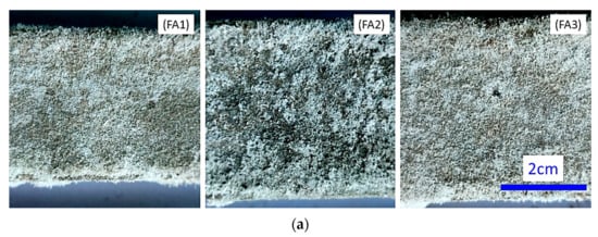 The preparation of mortar samples involved the combination of silica–alumino precursors and additives, according to the ratios specified in Table 2, which resulted in a uniformly mixed composition (Figure 3). Subsequently, an alkaline solution was introduced and gently mixed for three minutes to create a fresh mortar paste. The fine aggregate was then added, and the mixture was stirred for an additional three minutes to achieve a consistent mortar consistency. The fresh mortar mixtures were cast into steel molds with dimensions of 40 mm × 40 mm × 160 mm and 25 mm × 25 mm × 280 mm, with the casting process involving two layers and the application of vibration to ensure even compaction. The samples were cured at room temperature (23 ± 2 °C with ≥50% relative humidity) without the use of a sealant, facilitating the observation of surface fluorescence under open-air conditions [49,50]. For sample no. FA1, which exhibited a slower rate of hardening, as indicated in Table 2, the mold was removed after three days, and curing was continued until the designated measurement age was reached.