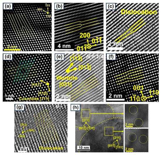 Visualization of dislocations by transmission electron microscopy in HPT-processed ceramics (a) MgO [51], (b) anatase TiO2 [52], (c) brookite TiO2 [53], (d) columbite TiO2 [54], (e) ZnO [55], (f) ZrO2 [56], (g) BiVO4 [57], and (h) GaZnON [33].
