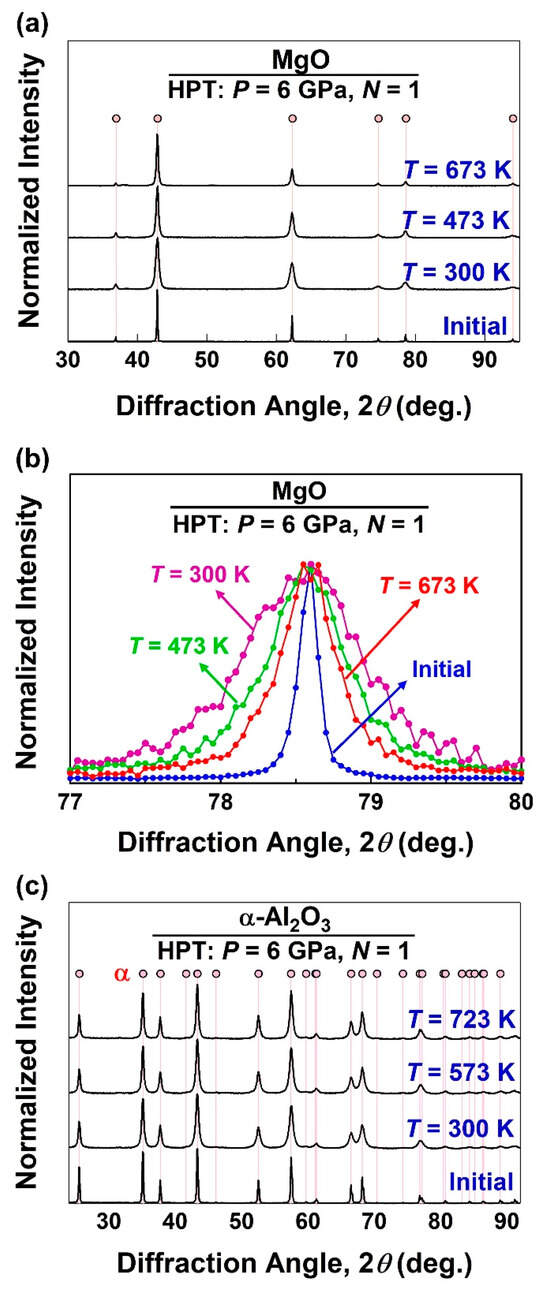 Samples of ceramic powders, including typical oxides MgO (99.99% from Kojundo, Sakado, Japan), α-Al2O3 (99.99% from Kojundo, Japan), γ-Al2O3 (99.9% from Kojundo, Japan), ZnO (99.5% from Kanto Chemicals, Tokyo, Japan) and BiVO4 (99.9% from Alfa Aesar, Lancashire, UK) were subjected to HPT under different strain conditions. These five oxide ceramics were selected as representative ceramics with diverse crystal structures and a wide range of mechanical and functional applications such as load-bearing parts, solar cells, photocatalysts, and so on. An appropriate number of samples (300 mg for MgO, 500 mg for Al2O3, 400 mg for ZnO, and 410 mg for BiVO4) were compacted to discs with 10 mm diameter using a manual press under a pressure of 0.38 GPa. The compacted discs were processed by HPT under a pressure of 6 GPa and a rotation speed of 1 rpm using a pair of anvils made from a WC-11Co (wt%) composite. The shear strain (γ = 2 πrN/h; γ: shear strain; r: distance from the rotation axis, N: HPT turns, h: material thickness) was introduced by applying rotation numbers of N = 0 (pure compression), 1/16, 1/4, 1, and 4 at various temperatures of T = 300, 473, 573, 673, and 723 K (not all samples were processed under all these conditions). It should be noted that a temperature rise usually occurs during HPT processing at room temperature, but its level was not significant in this study to affect the microstructural evolution (<20 K measured by a thermocouple located in the upper anvil of HPT and by an optical thermometer). This insignificant temperature rise, which is in good agreement with an earlier study using experiments and finite element simulation [66], is due to the acting of massive HPT anvils as heat sinks. The samples after HPT, which were in the form of compacted discs with dark colors, were crushed using a mortar and pestle for XRD analysis. Detailed structural and microstructural evolution for these ceramics during HPT are given in the literature for MgO [51], α-Al2O3 [45], γ-Al2O3 [67,68], ZnO [55], and BiVO4 [57].