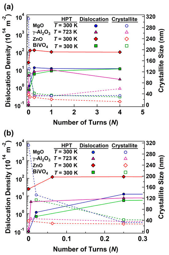 Variations in dislocation density and crystallite size versus the number of HPT turns for MgO processed at room temperature, γ-Al2O3 processed at 723 K, ZnO processed at room temperature, and BiVO4 processed at room temperature, where (b) is a magnified view of (a) at low number of turns.