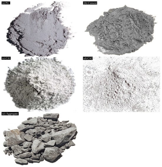 The phosphogypsum (PG) collected from a yard in Sichuan Province, China, was observed to have a grayish-white coloration and a pH of 5.4. The cement was a 42.5-grade ordinary silicate cement procured from a cement factory in Chongqing, China, and it was a gray substance. The primary components of the curing agents are slag, silica fume, and sodium hydroxide, among others. The aggregate is limestone, and its related technical indexes meet the requirements set forth in JTG/E42-2005, “Test Methods of Aggregate for Highway Engineering”. [24] The grading design is presented in Table 1. The morphology of all raw materials is illustrated in Figure 1.