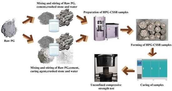 In accordance with T 0843-2009, “Sample Preparation Methods of Materials Stabilized with Inorganic Binders”, and T 0845-2009, “Curing Test Methods of Materials Stabilized with Inorganic Binders”, as outlined in JTG E51-2009 [25], a cylindrical test mold with diameter × height = ϕ100 mm × 100 mm was constructed, and graded crushed stone that had been moistened for one hour was along with the inorganic binders, which were then mixed thoroughly and added to the mold. The samples were prepared using a pressure testing machine and placed in a plastic bag after demolding. The samples were then placed in a curing box at 20 ± 2 °C and 95% humidity for curing. On the day prior to the testing date, the samples were removed from the plastic bag and immersed in water for 24 h. Thereafter, the relevant tests and characterizations were carried out. Figure 2 illustrates the preparation process.