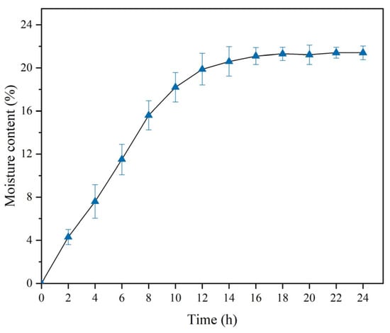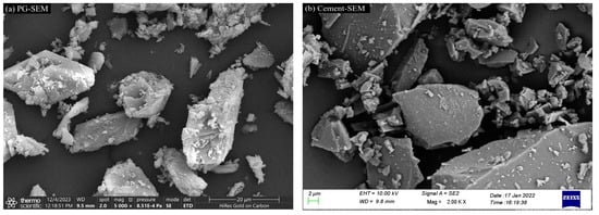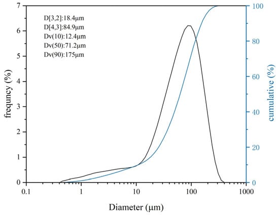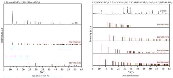 The scanning electron microscope (SEM) and X-ray diffraction (XRD) scans of PG and cement are presented in Figure 3 and Figure 4, respectively. The chemical compositions are provided in Table 5. The PG was found to consist primarily of dihydrate gypsum (CaSO4·2H2O) and quartz (SiO2), with narrow, sharp characteristic peaks that indicate high crystallinity and large grains; the cement was primarily composed of C2S(3CaO·SiO2), C3A(3CaO·Al2O3), C4AF, and C3S. The water content in the PG was determined by the drying method, as the crystalline water in the PG is easily removed at high temperatures. The raw PG was subjected to drying in an oven maintained at a constant temperature of 70 °C for 24 h, with the mass of the sample weighed every two hours, as illustrated in Figure 5. After 16 h, the moisture content exhibited a tendency to stabilize, and the final moisture content of the PG was determined to be 21%. The particle size distribution of the PG is illustrated in Figure 6. The distribution range is approximately 0.3 μm to 400 μm with a median particle size of 71.2 μm.