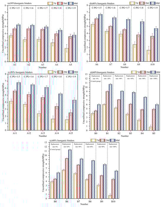 Figure 7a–c illustrates the 7 d, 28 d, and 60 d UCS of HPG-CSSB at varying cement, PG, and crushed stone admixtures. Overall, the UCS of the samples demonstrated a tendency to increase and then decrease as the percentage of inorganic binders increased. It was observed that as the cement PG ratio increased, the UCS of the samples also increased. Among samples with the same cement PG ratio, the 7 d UCS with 40% inorganic binders is higher than those with 30% and 50% inorganic binders. This is due to the fact that at the early stage in the context of maintenance, it is observed that a greater proportion of PG is not converted into ettringite (AFt) but rather utilized as filler aggregate within the mixture. The structure of the mixture can be classified as belonging to the suspension and compacting types. At this juncture, the structure of the mixture is in a suspended state, with an inorganic binder proportion of 40%, which is conducive to the formation of a stable skeleton structure. PG lacks cementing properties; thus, it primarily reacts with 3CaO·Al2O3 (C3A) in cement clinker to form AFt, thereby enhancing strength. Consequently, increasing the cement dosage while maintaining the same percentage of inorganic binders results in a higher 7 d UCS for the sample. The high dosage of PG will impede the cement hydration process, resulting in an incomplete cement hydration reaction in the initial stages of the system. This, in turn, affects the 7 d UCS to a certain extent. However, as the curing period progresses, the C3A continues to react with PG, resulting in the generation of a substantial quantity of AFt. Additionally, the hydrated calcium silicate (C-S-H) released from 2CaO·SiO2 (C2S) in the cement clinker at the later stage of hydration contributes to an enhancement in the specimen strength. This is evidenced by an observed increase in the 28 d and 60 d UCS. Furthermore, the increase in UCS of the samples with a lower cement PG ratio is more pronounced in the later stage, which results in a relatively minor discrepancy in 60 d UCS of different cement PG ratios. Given that the cement dosage is typically not in excess of 5% in the context of road subgrade engineering, the aggregate accounted for 60%, the inorganic binders for 40%, and the cement PG ratio of 1:7 for A8 represents the optimum mix ratio. Under this mix ratio, the UCS with different curing ages was 3.9 MPa, 4.9 MPa, and 6.0 MPa at 7 d, 28 d, and 60 d, respectively. In the current Chinese specification, cement stabilized materials are primarily assessed based on their 7 d UCS, with the UCS of A8 capable of attaining the requisite strength standard for highway base layer under both medium and light traffic loading levels.
