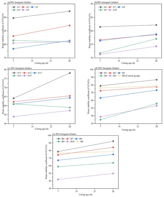 The water stability index is a key indicator for assessing the durability of subgrade materials. Figure 8 illustrates the water stability coefficients of the 7 d and 28 d UCS of HPG-CSSB. In this test, the water stability coefficients were determined by calculating the ratio of the UCS of the water-saturated curing samples to that of the conventional curing samples. As PG is a highly absorbent powder with no cementitious properties, higher dosing will result in poorer water stability of the samples after immersion in water. The water stability of HPG-CSSB is primarily attributable to the hydration products of cement. The C-S-H gel and AFt generated by cement hydration serve to densify the pores between the aggregates, thereby reducing the degree of water intrusion into the samples. Consequently, the water stability coefficient of the samples with a higher cement dosage in the same percentage of inorganic binders is also higher. The water stability coefficient of each mix ratio increases with age due to the slow initial hydration rate of the stabilized material, leading to enhanced structural stability and reduced external water influence.