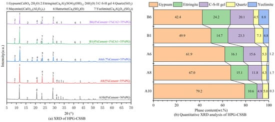The XRD patterns and quantitative XRD analysis of HPG-CSSB 28d at varying coordination ratios are illustrated in Figure 8a,b, respectively. Figure 8 illustrates the primary hydration products of HPG-CSSB, which include Ettringite (Ca6Al2(SO4)3(OH)12·26H2O), C-S-H gel, Quartz (SiO2), and Yeelimite (Ca4Al6O12(SO4)), and Yeelimite and Ettringite belong to the crystal structure of Ettringite [28]. Given that the C-(A)-S-H hydration product is amorphous in nature, it is not discernible in XRD analysis [29]. Quartz and gypsum (CaSO4·2H2O) are unreacted phases of raw PG. The presence of Ca(OH)2 was not detected, which was attributed to the conversion of Ca(OH)2 to C-S-H by volcanic ash reaction with SiO2 during the later stages of hydration.