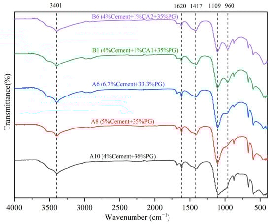 Figure 10 illustrates the Fourier transform infrared spectra (FTIR) of HPG-CSSB with varying mix ratios. The FTIR of the samples without added curing agent exhibited comparable absorption peaks, suggesting that the distinct cement PG ratios did not exert a substantial influence on the nature of the hydration products, which predominantly comprised C-S-H gels and AFt crystals. In the FTIR of B1 and B6 with the addition of the curing agent, an asymmetric stretching vibrational band of Si-O-Al at 960 cm−1 can be observed [31], which indicates the generation of C-(A)-S-H gel [32]. This is due to the high volcanic ash activity provided by the curing agent to the system, which caused Ca2+ in PG to react with Al2O3 and SiO2 to generate C-(A)-S-H gels. The bending vibration peaks of OH− at 3401 cm−1 and 1620 cm−1 are primarily attributed to crystal water or bound water in PG [33]. The observed weakening of the hydroxyl absorption peaks suggests an increased involvement of PG in the hydration reaction. The asymmetric telescopic vibration band of CO32− at 1417 cm−1 indicates that the sample has undergone a carbonation reaction with CO2 in the air. The lower peak heights of the absorption peaks of the Si-O asymmetric stretching vibrational bands at 1083 cm−1–1122 cm−1 indicate that after the introduction of the curing agent, additional hydration products, AFt crystals, and C-S-H gels were produced in the system, which would weaken the bond energy and lead to the breakage of the Si-O bonds [34,35].
