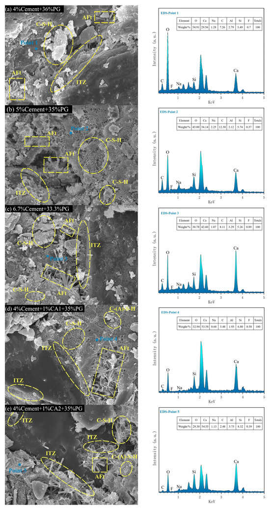 The SEM-EDS images of the ITZ of B1 and B6 28 d are presented in Figure 11d,e, while Figure 11b serves as a control group in the absence of a hardener. In comparison to Figure 11b, a considerable number of needle-and-rod AFt, in addition to foil-like C-S-H gel that is firmly attached to or encases the ITZ, and flocculent hydrated calcium silica-aluminate (C-(A)-S-H) gels that are partially formed by the hydration of the curing agent, can be observed in Figures. The alkaline slag-base polymer curing agent partially neutralized the weakly acidic environment provided by the highly dosed PG. This process not only stimulates the hydration activity of the cement but also causes a significant reaction of the large amount of Ca2+ supplied by the PG with the SiO2 and Al2O3 in the slag, producing C-S-H gels and C-(A)-S-H gels through a second hydration distinct from the hydration of the cement. This subsequently binds with the ITZ, wrapping around the AFt skeleton in a more stable manner, and through adhesion, immobilizes it, which results in a reduction in internal pores and an overall increase in density. This is reflected in the macroscopic performance, with the UCS of B1 and B6 exhibiting a notable improvement compared to that of B0. In comparison to Figure 11d, an increased amount of AFt is visible in Figure 11e. This is attributed to the fact that the metakaolin in CA2 stimulates the generation of AFt in the hydration products, thereby further enhancing the mechanical properties of the specimens through the reinforcement of the AFt skeleton. This is not a result that can be obtained with CA1. The elevated Ca and Si levels in EDS points 4 and 5 relative to EDS point 2 indicate that the incorporation of the curing agent results in enhanced C-S-H and C-(A)-S-H formation, which is corroborated by the observations presented in Section 3.4 and Section 3.5.