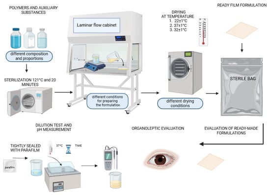 Film formulations were developed utilizing the solvent-casting technique within a controlled laminar flow cabinet. This method is recognized for its ability to produce uniform films with desirable mechanical and physical properties, making it suitable for various applications, including drug dosage forms. A total of 82 series (from A to I, provided in the Supplementary Materials) of polymer film formulations were fabricated, each varying in the composition of key ingredients, such as polyvinyl alcohol with degrees of hydrolysis of 98–99 and 85–89% (2.5%, 5%, and 10%), polyvinylpyrrolidone (5% and 10%), hydroxypropyl methylcellulose (2.5% and 5%), methylcellulose (MC 400 cP—1%, 3%, and 5%; MC A15C—1%, 3%, and 5%), pullulan (2.5% and 5%), , sodium carboxymethyl cellulose (4%), and glycerol (0.15 g, 0.25 g, 0.4 g, 3 g, 4 g, and 5 g). The variations in the formulations were designed to explore the effects of different polymer combinations and preparation conditions on the resulting film properties. Figure 1 shows a schematic procedure for obtaining a composite film preparation.