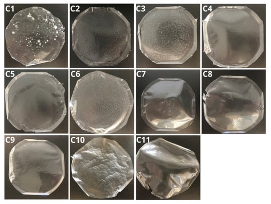 Series C1–C11 of the produced polymeric films with 0.15 g GLY: C1 (50/50 10% PVA, 3% MC A15C), C2 (50/50 10% PVA, 1.5% MC A15C), C3 (50/50 10% PVA, 3% MC A15C), C4 (50/50 10% PVA, 1% MC 400), C5 (50/50 5% PVA, 3% MC 400), C6 (50/50 5% PVA, 1.5% MC 400), C7 (50/50 10% PVA, 2.5% pullulan), C8 (50/50 10% PVA, 2,5% HPMC), C9 (50/50 10% PVA, 2.5% PVP), C10 (50/50 5% PVA, 1.5% MC A15C), and C11 (50/50 5% PVA, 5% pullulan). In all formulations, PVA had a degree of hydrolysis of 98–99%.