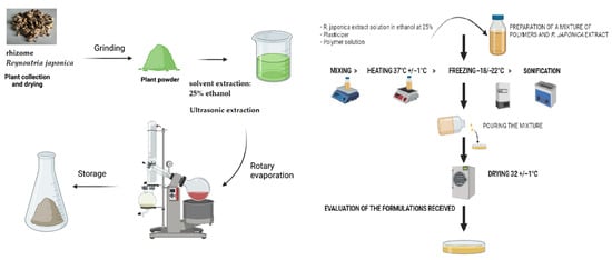 The plant extract from the rhizome of Reynoutria japonica was prepared according to the procedure described in [33,34]. Fifty grams of air-dried and powdered rhizomes of R. japonica was used for the extraction process. The powdered rhizomes were extracted with 500 mL of 25% ethanol. Extraction was performed using an ultrasonic bath for 2 h. After extraction, the solvent was evaporated under reduced pressure to obtain the dried extracts.