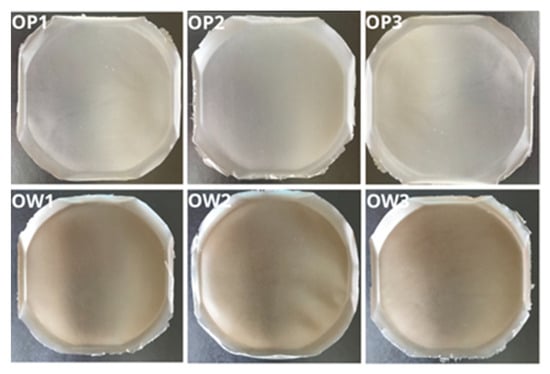 Photographic documentation of the optimized films: placebo series (OP1, OP2, and OP3) and those containing the plant extract from R. japonica (OW1, OW2, and OW3).