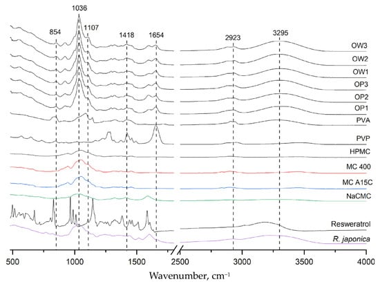 Figure 5 presents the infrared absorption spectra for all polymer components: polyvinyl alcohol (PVA), polyvinylpyrrolidone (PVP), methylcellulose (MC), hydroxypropyl methylcellulose (HPMC), sodium carboxymethylcellulose (NaCMC), powdered Reynoutria japonica extract, pure resveratrol standard, placebo films (OP1, OP2, and OP3), and three film formulations containing R. japonica extract (OW1, OW2, and OW3). The PVA spectrum exhibited a characteristic band in the range of 3000–3500 cm⁻1, centered around 3295 cm⁻1, corresponding to the stretching vibrations of hydroxyl (OH) groups involved in intra- and intermolecular hydrogen bonding. The PVP spectrum showed a peak at 1654 cm⁻1, which is associated with the stretching vibrations of the carbonyl (C=O) bonds in the pyrrolidone ring. Additionally, a broad absorption band between 1050 and 1430 cm⁻1 was observed, corresponding to the stretching vibrations of C-O bonds and the bending of -CH₂ and -CH groups. This broad band is prominent in the spectra of MC, NaCMC, and HPMC, indicating their structural similarity in this region. In the FT-IR spectra of the placebo formulations (OP1, OP2, and OP3) and the films containing R. japonica extract (OW1, OW2, and OW3), no new absorption bands were observed beyond those characteristic of the formulation components. The 3295 cm⁻1 band confirmed the presence of PVA, while the 1654 cm⁻1 band corresponded to PVP. The broad band in the range of 1036–1418 cm⁻1 was attributed to methylcellulose or its derivatives. The FT-IR results indicate a lack of interactions between the extract components and the polymers in the film.