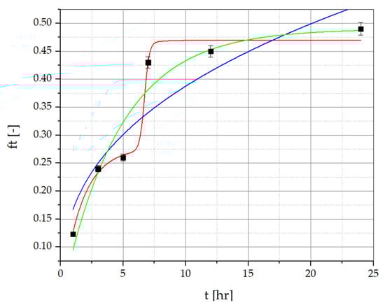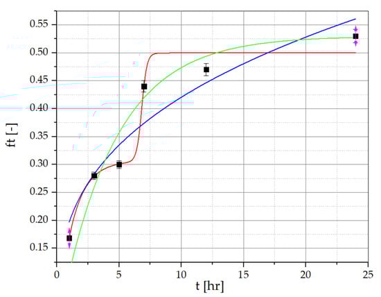 Resveratrol release data for PVA/PVP/MCA15C/NaCMC film layers with R. japonica extract. ▪ Experimental points (statistically significant with p ≤ 0.05) approximated with the Korsmeyer–Peppas model (green line), the multidimensional model (red line), and the first-order kinetic model (blue line).