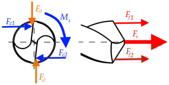 The aim of the experimental study was to determine the effect of the cutting speed vc and the feed per revolution f on the values of the axial component of the cutting force Fz and the torque measured in the tool axis Mz. The system of forces occurring in the analyzed drilling process is shown in Figure 2. The axial force Fz is the sum of the feed forces Ff1 and Ff2. The moment Mz was obtained from the forces Fc1 and Fc2. The forces Fp1 and Fp2 reduce each other, so there was no resultant force.