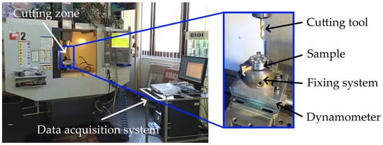 To measure the cutting force, a measuring stand was set up based on the numerically controlled MiniMill2 machine (Haas Automation, Oxnard, CA, USA), the Kistler 9257B force gauge, the Kistler 5070A charge amplifier, and the Kistler DynaWare software (Kistler Instrumente AG, Winterthur, Switzerland). The 9257B piezoelectric force gauge converts forces and moments into a proportional electrical signal. This signal is amplified by a 5070A amplifier, converted to digital format, and analyzed in DynaWare v2825A software. The total measurement uncertainty of the equipment for measuring the force components is 3.6% FSO. The test stand is shown in Figure 3.