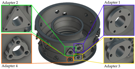 For the purpose of conducting research and analysis, an aircraft engine body was designed with four types of tooling adapters located in different places on the body (Figure 4). The largest external diameter of the body was 780 mm, while the height of the body was 390 mm. All holes in the tooling adapters were through holes. Figure 4 shows a view of the designed body and views of all types of tooling adapters.