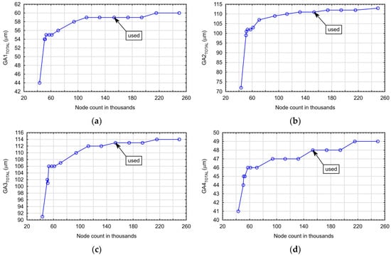 For all FEM calculations, the finite element mesh was built based on the triangle method, and dynamic mesh scaling was based on the model element sizes, which was 3%. The finite element meshes created on the simplified models (for the second-stage calculations) contained about 165 thousand nodes and 86 thousand elements. The mesh convergence graph for the body deformation GATOTAL occurring during the drilling of the hole in individual adapters is shown in Figure 5a–d.
