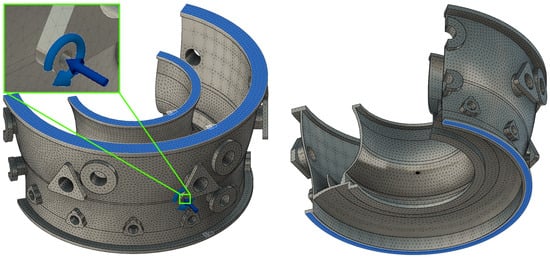 In order to reflect the method of fixing the parts during hole machining, on three flanges marked in blue (as seen in Figure 6), restraints were defined that blocked translations and rotations around all axes. Figure 6 shows isometric views of the simplified body together with the finite element mesh, fixings, and applied loads.