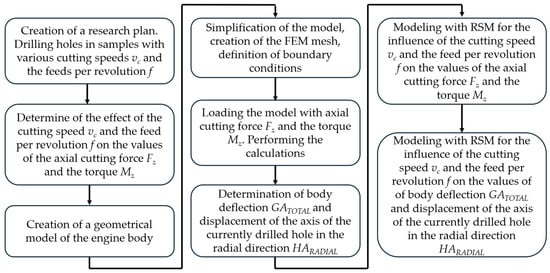Based on the proposed research method, it is possible to determine the body deflection and displacement of the hole axes resulting from the use of a set of drilling process parameters. The influence of the drilling process parameters on the cutting force and torque values for the tested material and tool was also determined. Based on the presented methodology, it was possible to scale to other cutting tools, machined materials, and body geometry. These results can be implemented in the process of designing the hole machining for the aircraft engine body. Based on the determined displacements of the hole axes, their positions can be corrected so that, as a result of machining, better accuracy of the arrangement of accessories and adapter holes for the aircraft engine body can be obtained. Values for cutting parameters that ensure that plastic deformation, causing body damage, which does not occur in the workpiece, can also be determined. Using the proposed solution, integration between the techniques of conducting the experiment, performing calculations using FEM, and designing the machining process is also achieved.