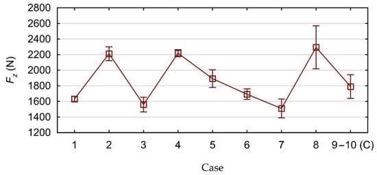 - The relatively high values of the axial force Fz, in the range of 1450–2432 N, and low values of the torque Mz in the range of 2.22–4.51 Nm were recorded.