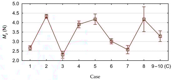 Based on the results obtained from the experimental tests, the influence of the tested cutting parameters vc and f on the values of the force Fz and the cutting torque Mz was determined. The calculated average values of the axial force Fz, together with their standard deviations, are shown in Figure 8. The calculated average values of the cutting torque Mz, together with their standard deviations, are shown in Figure 9. The calculated average values are the arithmetic mean calculated from three measurements performed for each position of the research plan (Table 2).