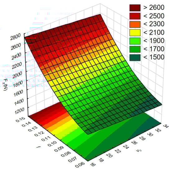 In the next step, RSM was used to present the results of the influence of cutting parameters on the result factors. Figure 10 shows the influence of the tested cutting parameters vc and f on the values of force Fz. In turn, Figure 11 shows the influence of vc and f on the values of torque Mz.