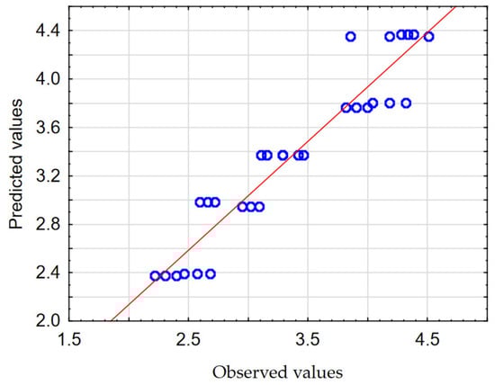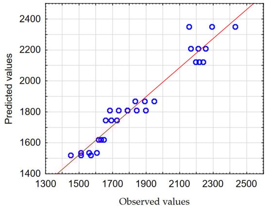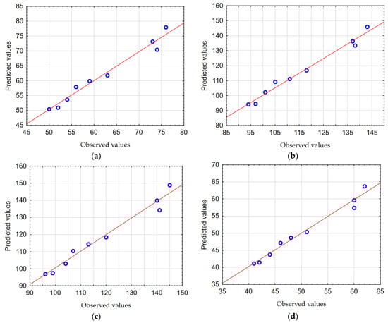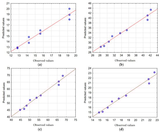 It was found that the mathematical models created describe the conducted experimental studies to a high degree. This was confirmed, among other methods, by obtaining Pearson correlation coefficients with values close to one and the observations are clustered around the regression line (Figure 16a–d).