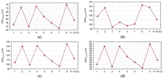 In order to check the quality, the obtained mathematical models were evaluated. The calculated Pearson correlation coefficients for GA1TOTAL, GA2TOTAL, GA3TOTAL, and GA4TOTAL were 0.985, 0.988, 0.986, and 0.988, respectively. The Predicted vs. Observed plots are shown in Figure 16a–d.