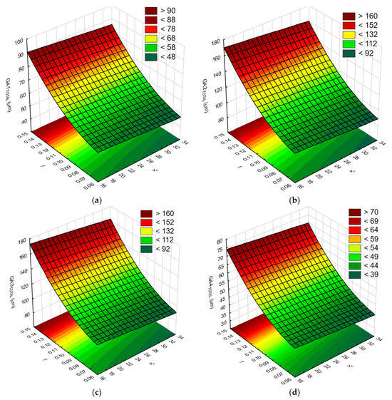 In the next step, the response surfaces were determined. Figure 15a–d show the influence of the tested cutting parameters vc and f on the values of the body global deflection GATOTAL.