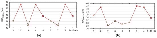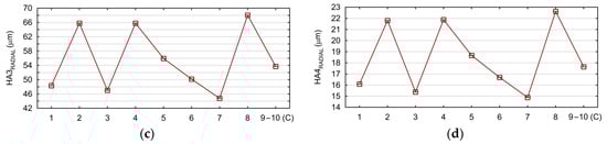 In order to check the quality, the obtained mathematical models were evaluated. The calculated Pearson correlation coefficients for HA1RADIAL, HA2RADIAL, HA3RADIAL, and HA4RADIAL were 0.979, 0.985, 0.988, and 0.988, respectively. The Predicted vs. Observed plots are shown in Figure 19a–d.