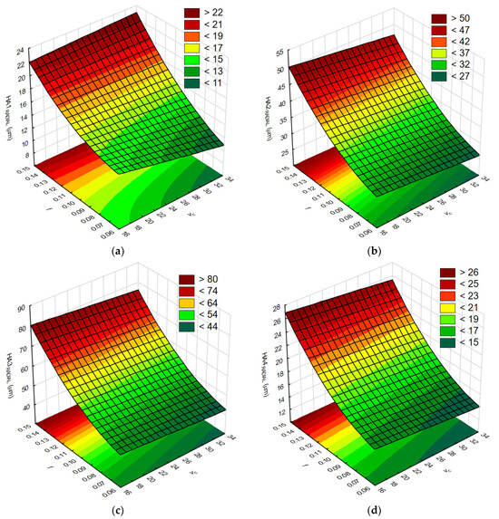 In the next step, the response surfaces were determined. Figure 18a–d show the influence of the tested cutting parameters vc and f on the values of the drilled hole axis displacement HARADIAL.